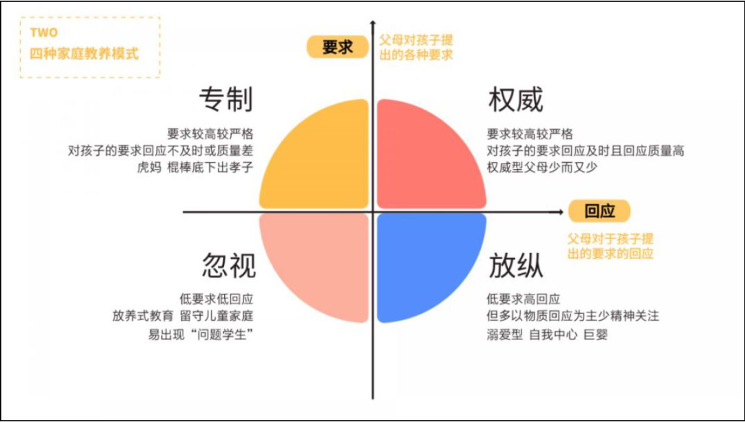 美国心理学家鲍姆林德(Baumrind)对父母的教养方式曾进行了为期十年的研究,根据要求和回应两个维度,将父母的教养方式分为权威型、专制型、溺爱型(放纵型)、忽视型四种类型。